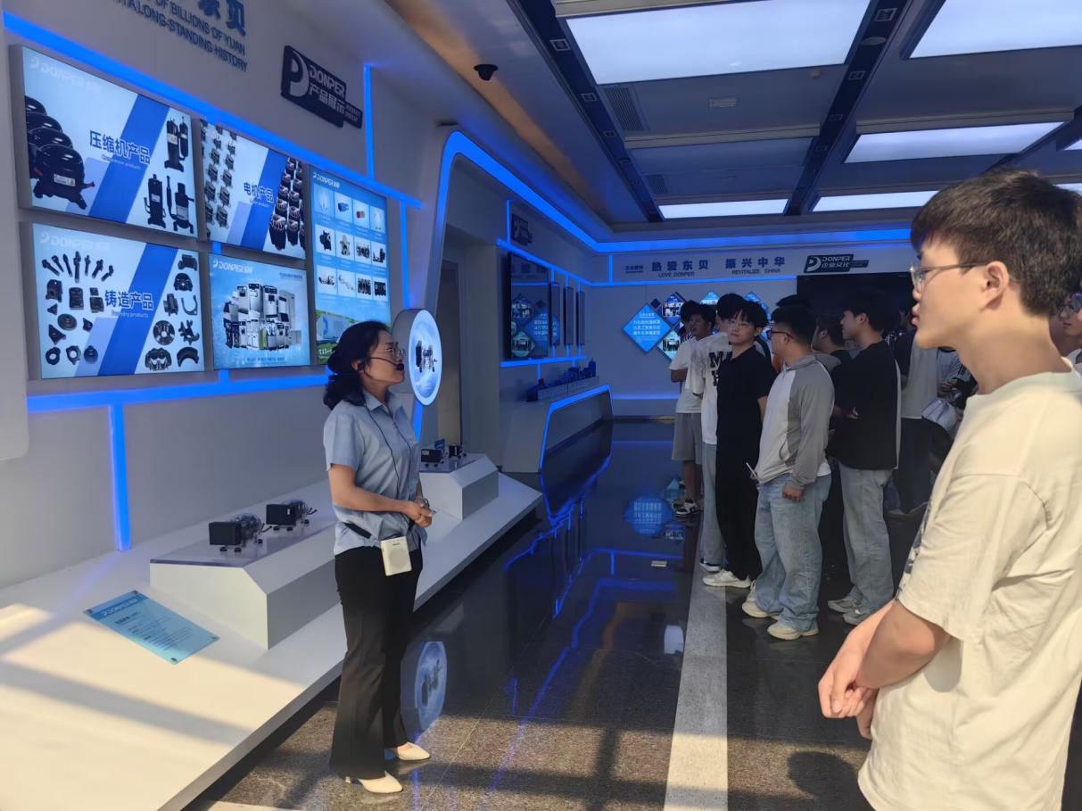 在黄石东贝电器股份有限公司智能制造基地,学生们实地观摩了全球领先的变频压缩机数字化生产线,讲解员系统讲解了永磁同步电机控制技术、智能检测系统等专业知识的工业应用场景,并观看了公司发展历程、目前成就及后续发展规划的视频在东贝制冷有限公司,师生不仅探访了新一代环保冷媒应用实验室,更深入冰淇淋机智能化生产车间,让学生了解课程中“智能制造与节能优化”的理论关联。